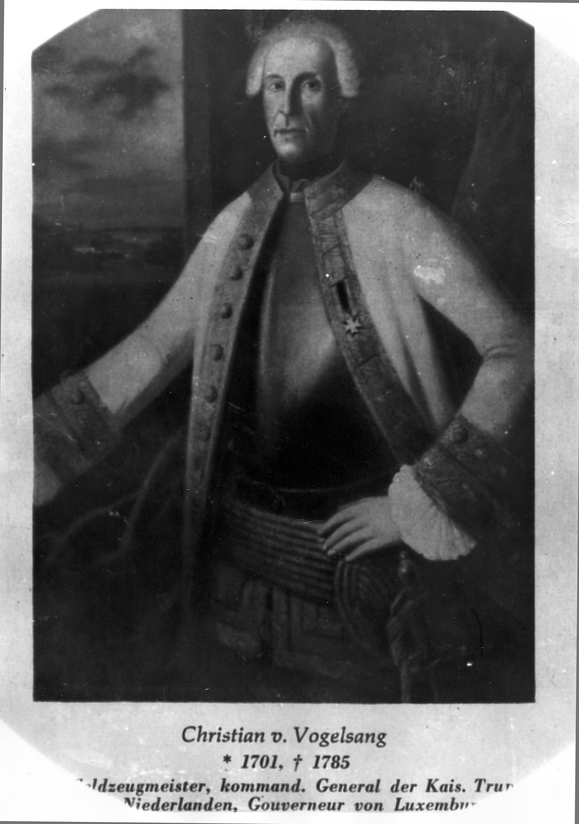 >Öfversten wälborne herr Kristian von Vogelsang som war född 1665 död d. 14 april 1731. Des saliga moder född d. 4 maij 1687 Margareta Regina Holting (skall vara Stolting). Salig herr ÖfversteLieutnanten är född d. 27 september 1716 i Cüstrin (Küstrin i Brandenburg) men aflad i Venedig. 1736 d. 20 Maij blef han volonteur wid Kongl Lifgardet i Stockholm, 1739 d. 8 aug rustmästare utan lön, 1741 bewistade Campanen i Finland, 1742 Commenderad til Stralsund efter recreuter. Samma år blef förare med lön och d. 8 aug sergeant. 1743 i Februarii afsändes allena med